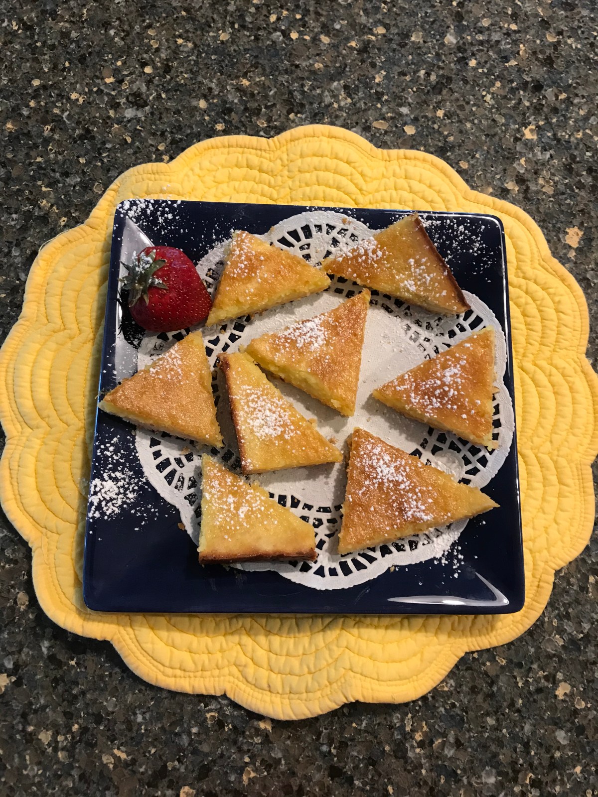 - Garnish with sifted confectioners’ sugar. When I make 3×3” squares, I serve them with whipped cream and berries.