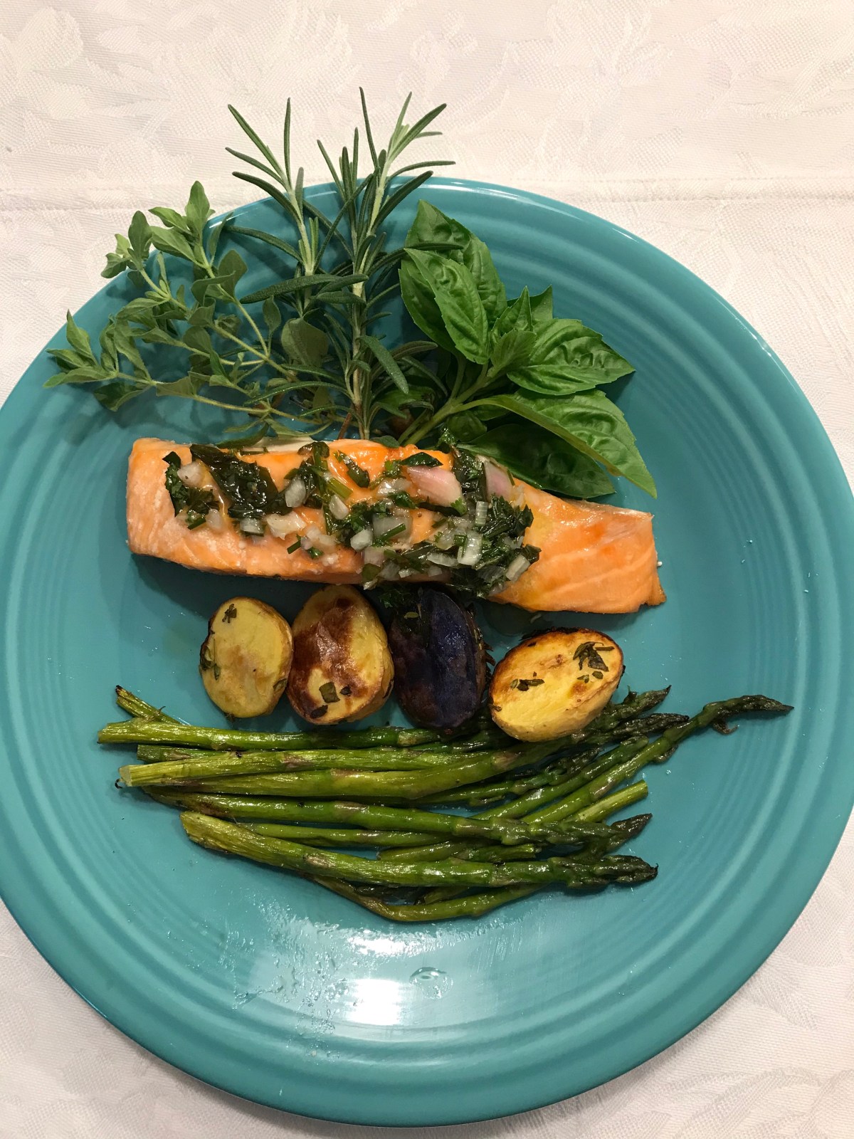 - Slice the salmon in 6 serving pieces and spoon French herb salsa on top.